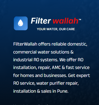 FilterWallah offers reliable domestic, commercial water solutions & industrial RO systems. We offer RO installation, repair, AMC & fast service for homes and businesses. Get expert RO service, water purifier repair, installation & sales in Pune.